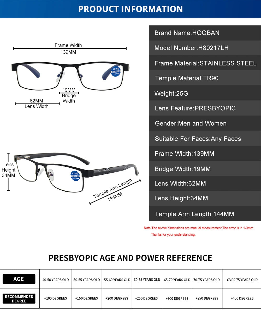 ESPECIFICAÇÕES Cenários aplicáveis: Negócios Marca: HOOBAN Certificação: CE Opções: Sim Tipo de elemento: Formal para Negócios Tipo de óculos: Óculos de leitura Material da armação: Aço inoxidável Gênero: Unissex Produtos químicos altamente preocupantes: Nenhum Tipo de item: ÓCULOS Altura da lente: 34 mm Largura da lente: 62 mm Cor das lentes: Transparentes Material das lentes: Plástico Atributo óptico das lentes: Antirreflexo Número do modelo: H80217LH Origem: China Continental Tipo de produto: Óculos de leitura da moda Estilo: Retangular